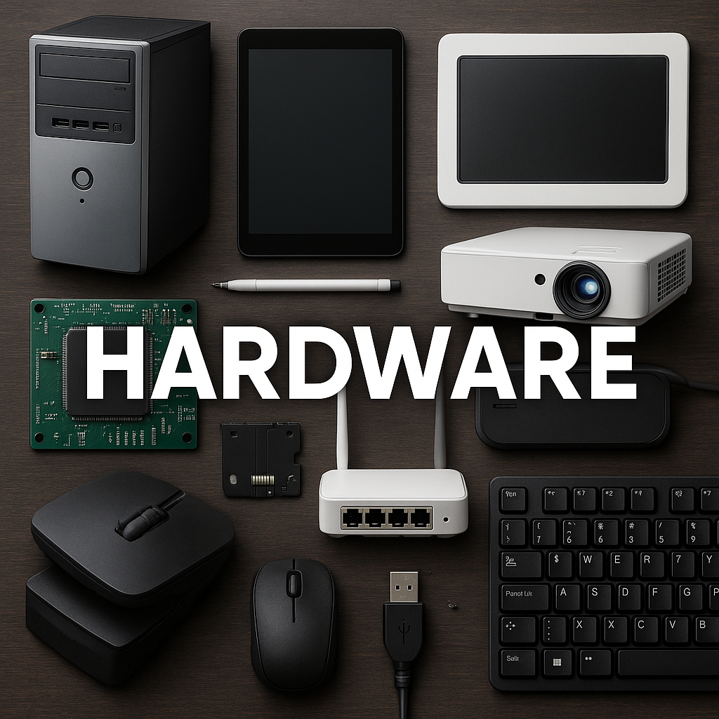 Es el conjunto de componentes físicos y tangibles de un sistema informático, como computadoras, notebooks, tablets, impresoras, proyectores, pizarras digitales, routers, placas electrónicas, sensores, y cualquier